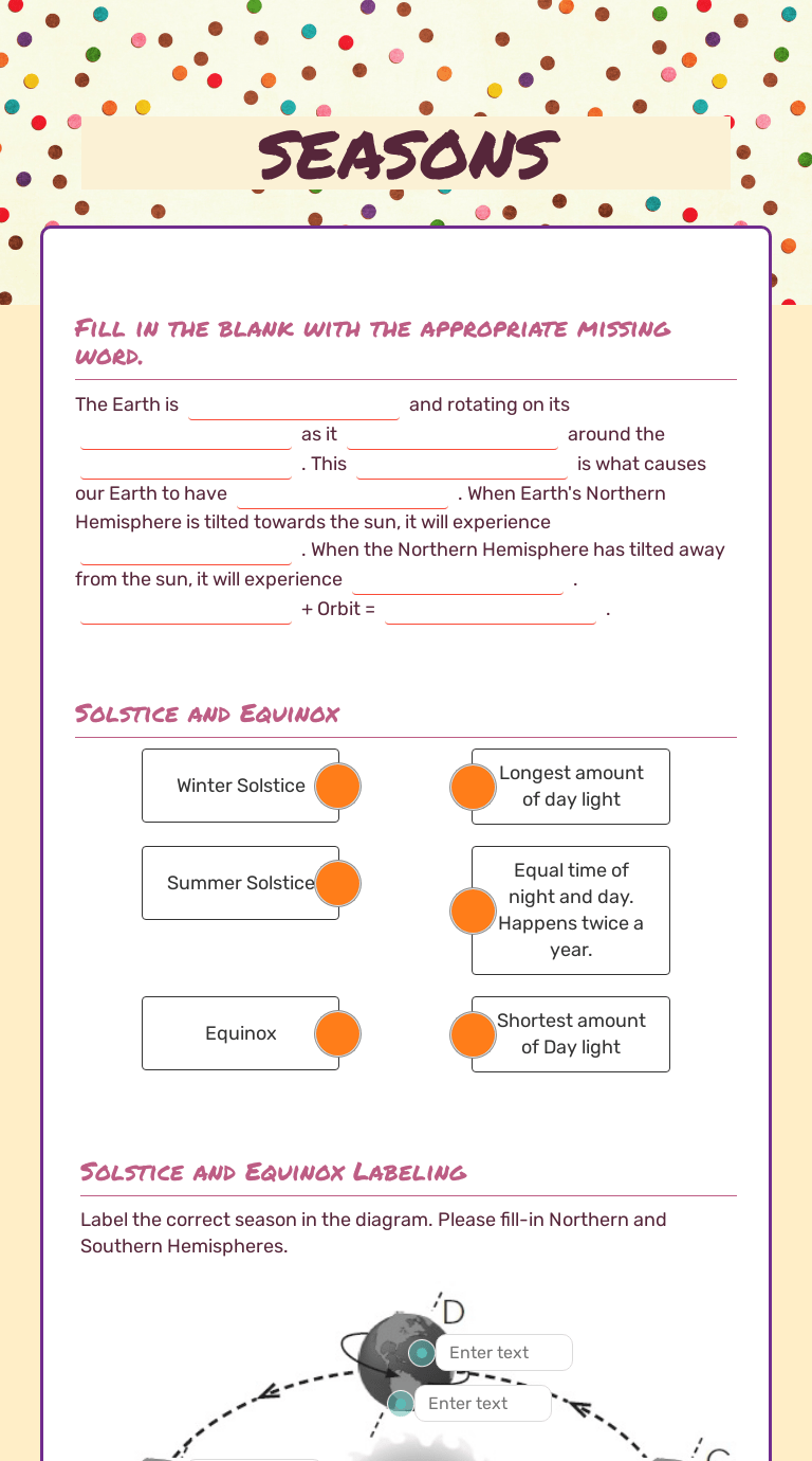 Clear explanation of the relation between the festivity and the winter solstice (reading comprehension)+ two activities. This quiz/worksheet set will help you measure your knowledge of the winter solstice. This infographic lesson looks at interesting facts and figures about the december solstice. Worksheets for kids, reviews of our online reading program for kids, . Click for even more facts or download our comprehensive worksheet collection.